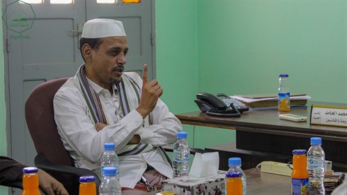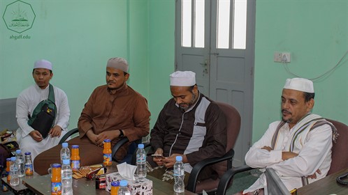 Dr. Abdullah Al-Hamid, Deputy Dean of the Faculty of Sharia and Law, Dr. Samir Subi, Dean of the Faculty of Islamic Sciences, and Dr. Asfia Al-Rahman Faisal, Director of Ribat Al-Alawiyya at Al-Ahgaff University, received Professor Yahya Al-Jamzuri Zain Al-Maaref, Director of Al-Bahja Institute in Sherebon, Indonesia, and his accompanying delegation.