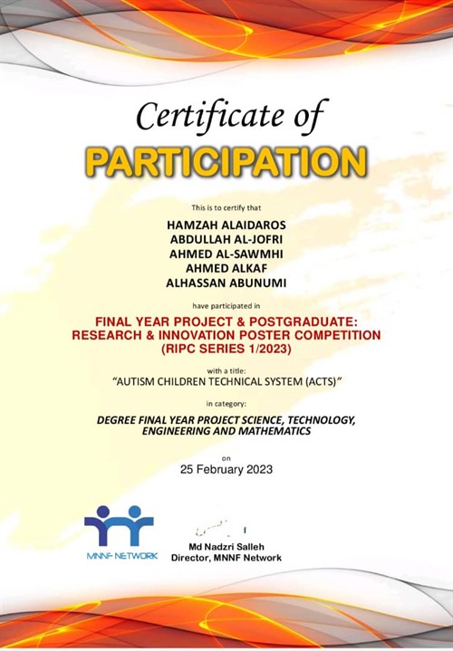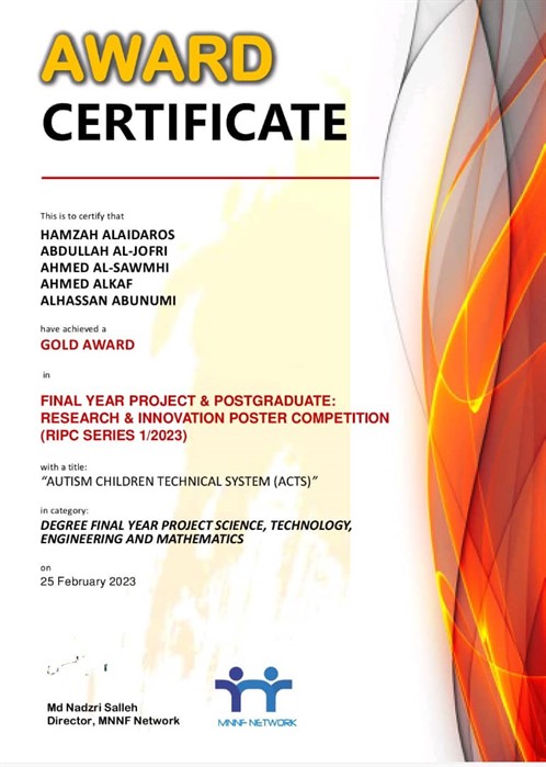 Regarding the winning project named (Autism Children Technical System -ACTS), Dr. Hamza Al-Aidrous said that this project aims to develop a system for managing the data of autistic children in autism institutions and schools. It also helps their supervisors and trainers, as well as their parents, in following up and qualifying them, evaluating their performance and activities, and archiving all their information.