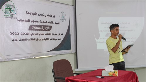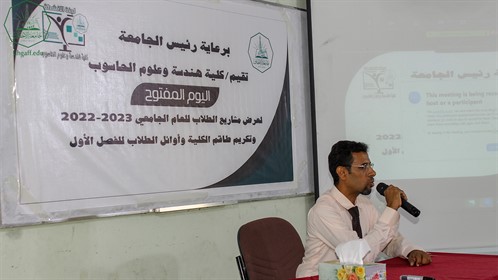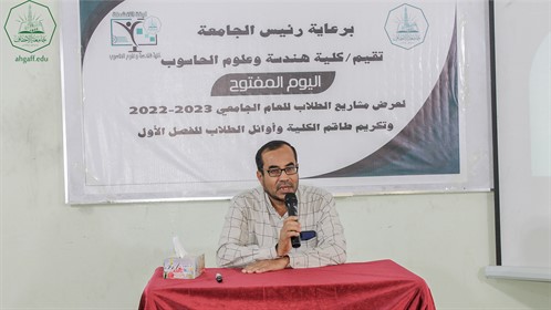 The Secretary General of the University, Eng. Fayez Bin Shamla, spoke about the importance of holding such events, which aim to apply the subjects and concepts taught in the department to reality, and provide an opportunity for students to highlight technical and programming talents. He thanked the Deanship of the Faculty, represented by Dr. Hassan Muqaibel and the Head of the Department, Dr. Muhammad Wahdin, for the efforts made to raise the educational level of the Faculty students, calling on the students to take advantage of the times and develop their skills through the continuous application of the subjects taught in the Faculty.